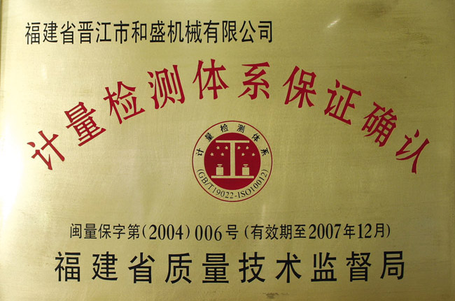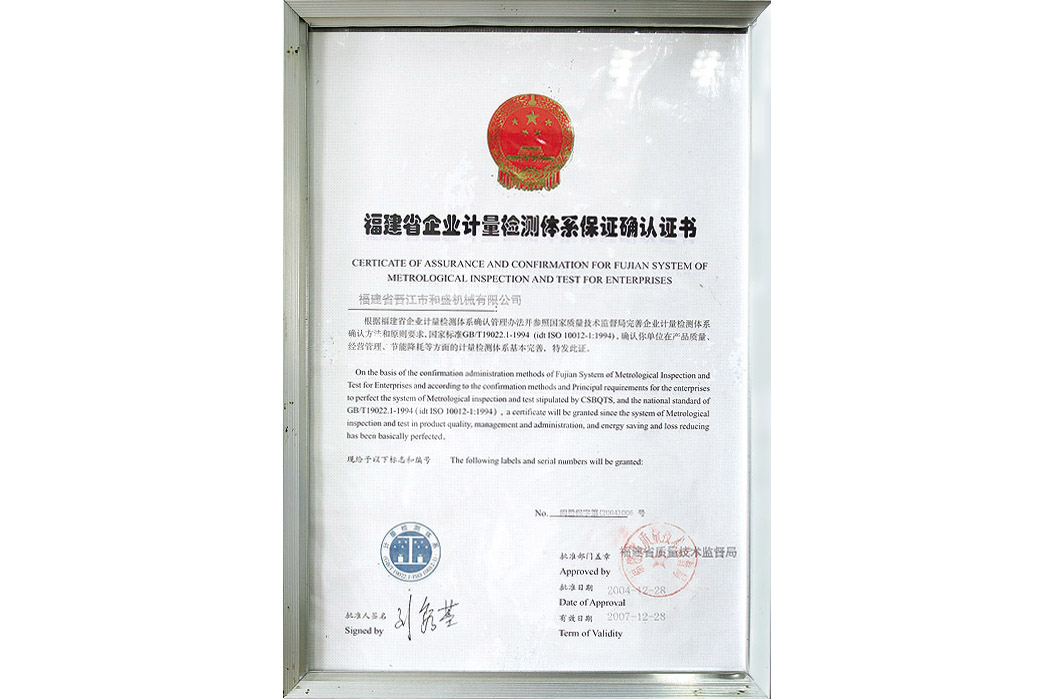 福建省企業計量檢測體系保證確認證書