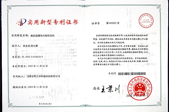 數控超薄型大板切石機實用專利證書