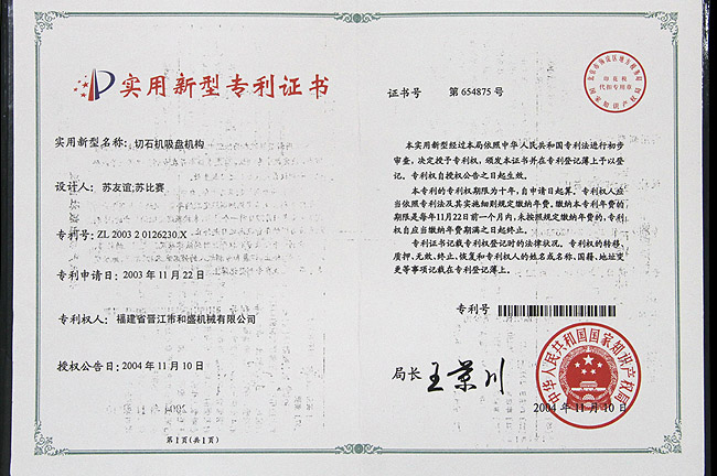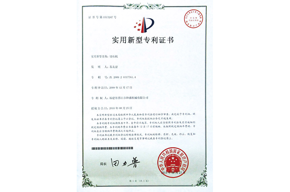 切石機實用新型專利證書