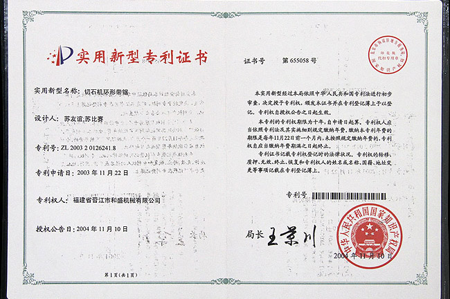 切石機環形帶鋸實用專利證書